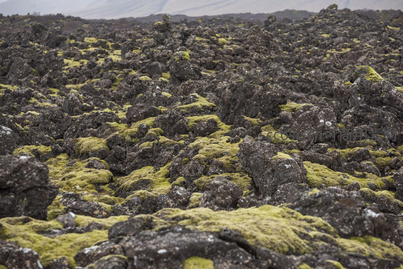 大片黑色熔岩被绿色苔藓覆盖,一直延伸到远方的地平线,天空灰蒙,营造出空旷、静谧又略带神秘的氛围。