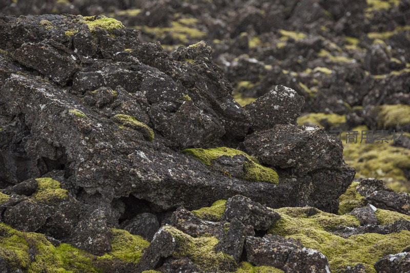 镜头聚焦于火山岩裂缝中生长的翠绿苔藓,细腻展现其柔软质感与岩石的粗犷肌理,体现自然细微处的生命奇迹。