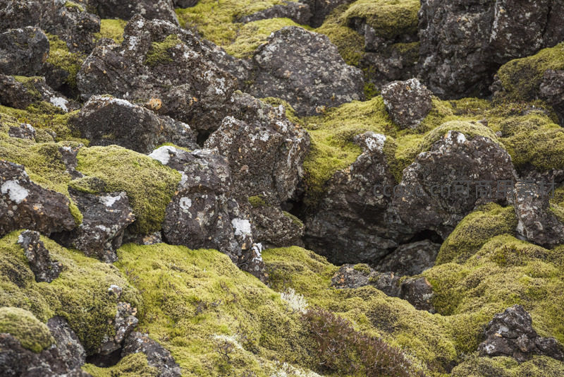 黑色粗糙熔岩被柔软青苔温柔覆盖,自然力量与生命韧性交织,呈现大地肌理与生态复苏的独特美感。