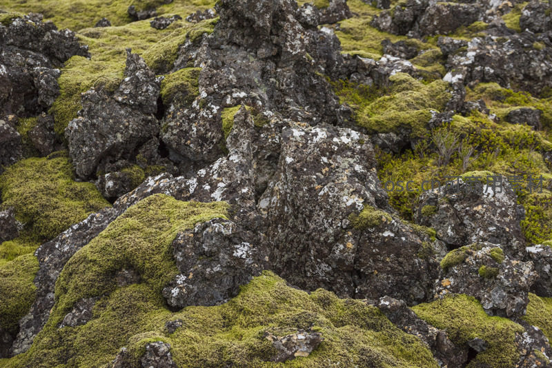 深色火山岩上覆盖着鲜绿苔藓,形成强烈色彩对比,展现原始自然生态的顽强生命力与独特地貌纹理。