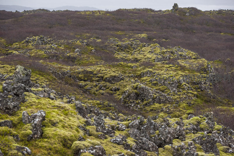 连绵丘陵上布满苔藓覆盖的火山岩,远处山峦朦胧,呈现辽阔苍凉又生机盎然的自然地理画卷。