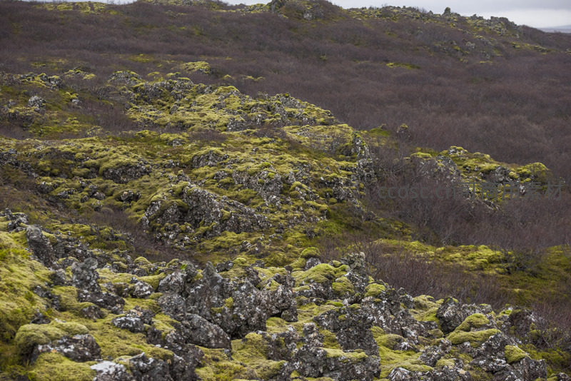 起伏的火山岩坡上苔藓如毯,与枯黄灌木相映成趣,构成一幅粗犷中蕴含细腻生机的自然风景画。