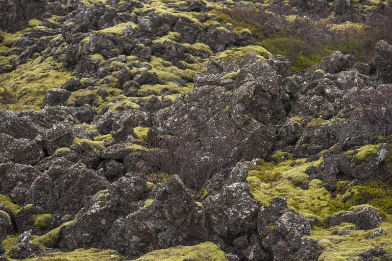 大片黑色火山岩如凝固的波浪,其上铺满柔软的绿色苔藓,构成一幅壮阔而奇异的自然画卷,充满原始野性魅力。