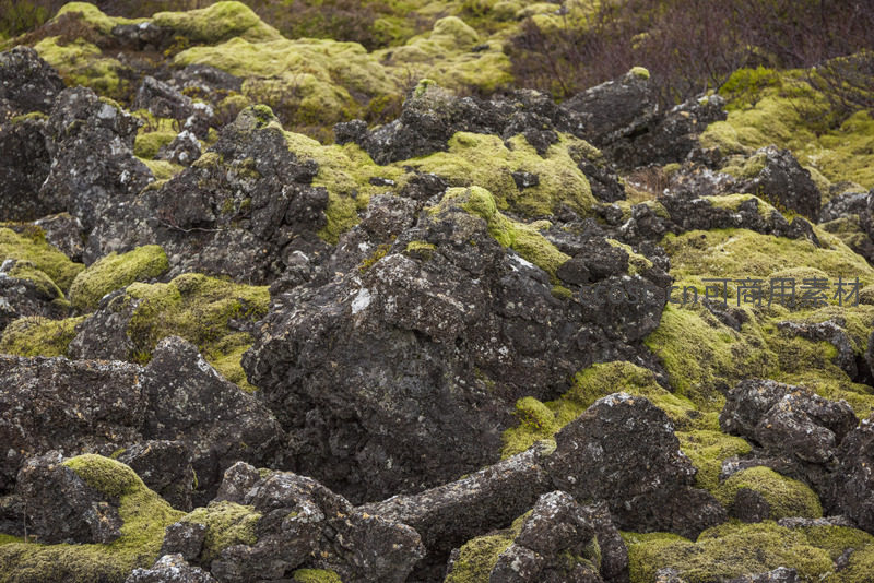 崎岖火山岩与柔嫩苔藓交织的大地纹理