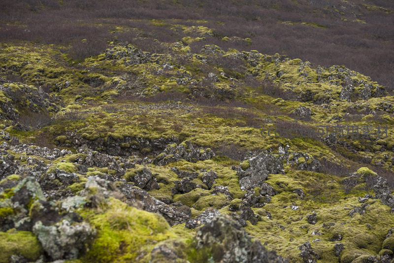 前景是布满苔藓的岩石山丘,背景是枯黄灌木丛,色彩对比鲜明,营造出宁静而略带苍凉的自然氛围。