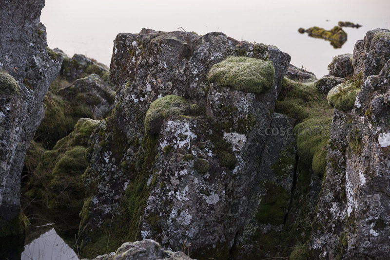 巨大的灰色岩石矗立在水边,表面覆盖着厚实的绿色苔藓和白色地衣,平静的水面倒映着景物,营造出幽静的氛围。