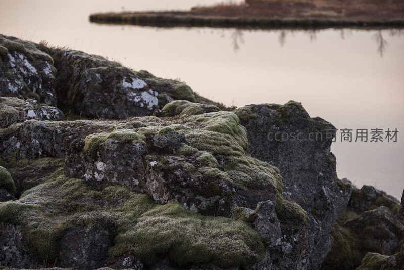 湖畔青苔覆盖的火山岩特写,宁静悠远