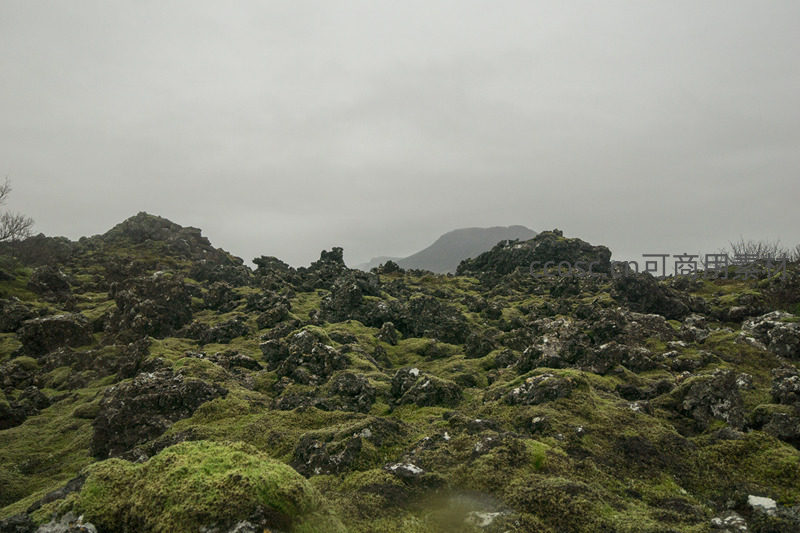灰暗天空下,苔藓覆盖的火山岩丘陵连绵起伏,远方山峦隐约可见,营造出苍茫而宁静的自然氛围。