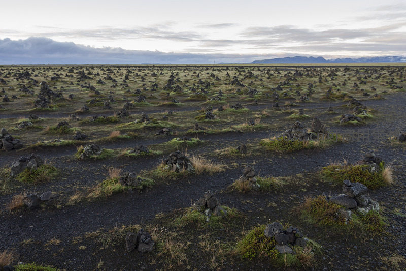黑色火山土壤上散布着零星的苔藓石堆,远处山脉与云层相接,构成一幅开阔而略带荒芜的自然画卷。