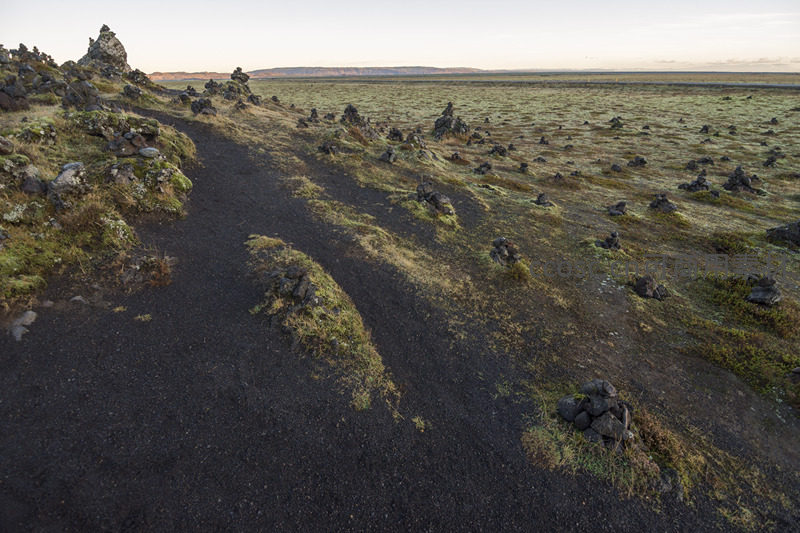 黑色火山熔岩与翠绿青苔交织,一条蜿蜒小径穿过广袤荒原,远处山峦起伏,展现原始而宁静的自然力量。