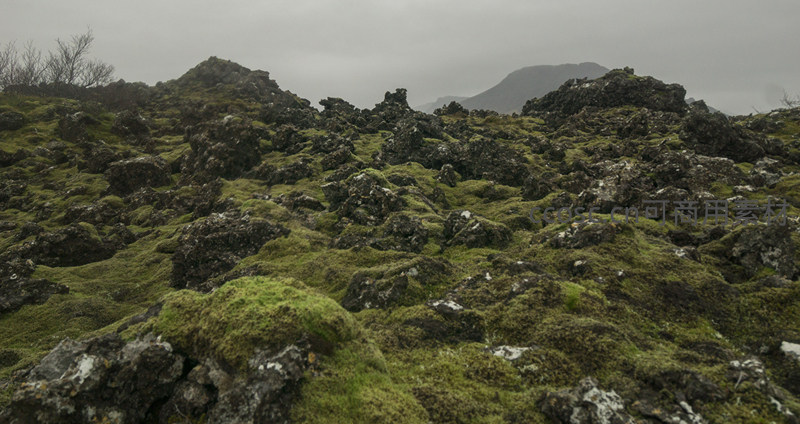 灰蒙天空下,深色火山岩被厚实青苔温柔包裹,岩石棱角与柔软苔藓形成鲜明对比,展现生命对荒芜之地的顽强征服。