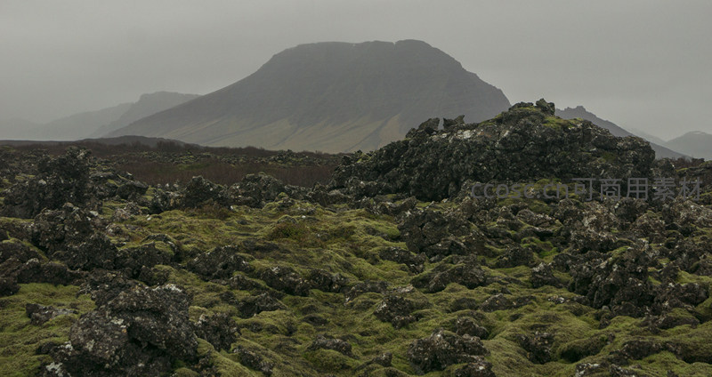 苔藓覆盖的火山岩地貌与远山