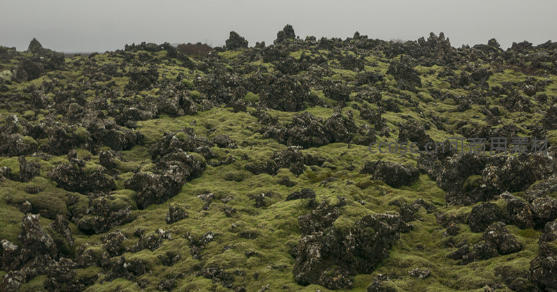 镜头聚焦于连绵起伏的火山岩,其粗糙表面被柔软苔藓包裹,形成独特的肌理与色彩对比,充满原始生命力。