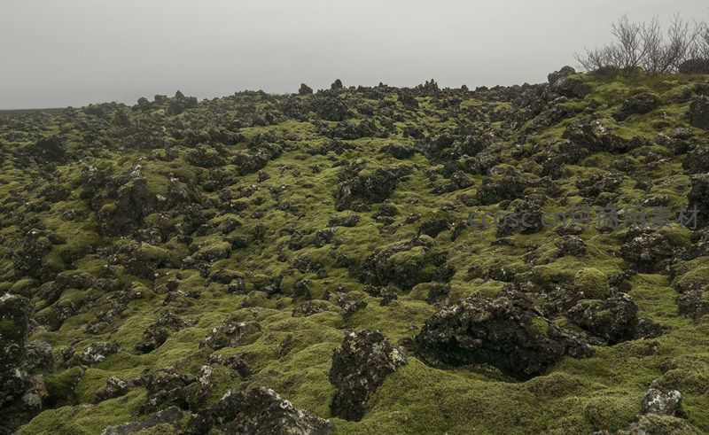低垂的云雾笼罩着铺满苔藓的崎岖丘陵,几株枯枝点缀其间,营造出一种神秘、孤寂又充满生机的北欧荒野意境。