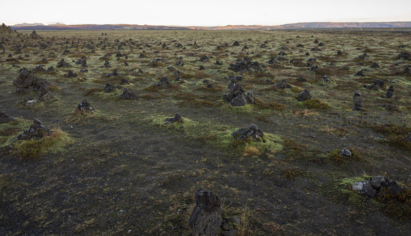 日落时分的苔藓石堆旷野