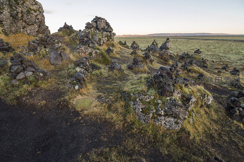 崎岖不平的火山岩堆散落在青苔覆盖的草地上,阳光斜照勾勒出立体轮廓,远处地平线开阔,营造出宁静而神秘的北欧荒原氛围。