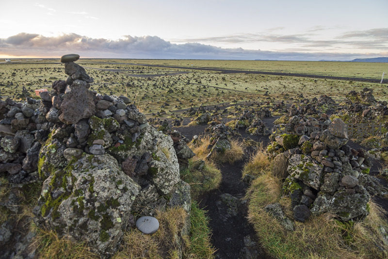 广袤的火山熔岩地上,遍布着人工堆砌的石堆,青苔点缀其间,远处草原与山脉在云层下延伸,构成一幅原始而宁静的自然画卷。