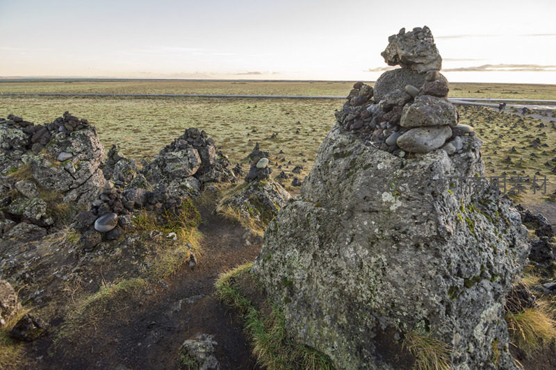 黄昏时分,一座高耸的火山石堆矗立在前景,背后是无垠草原与蜿蜒公路,远方行人渺小如点,天地间弥漫着静谧与时间的痕迹。