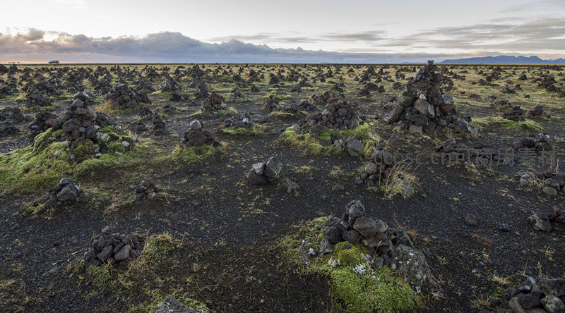 黑色熔岩平原上,成百上千的石堆有序或随意分布,部分覆盖绿色苔藓,在柔和天光下形成独特的视觉韵律,展现人与自然的微妙对话。