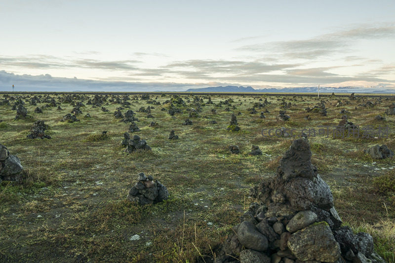 广袤苔原上散布着无数石堆,远处山脉在晨光中若隐若现,天空云层柔和,整体氛围宁静而苍凉,展现了原始地貌的独特美感。
