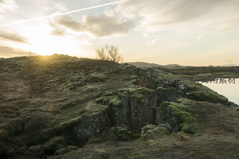 金色阳光穿透云层,温柔地洒在布满青苔的岩石上,旁边湖泊倒映天光,枯树点缀其间,构成一幅温暖而诗意的黄昏自然画卷。