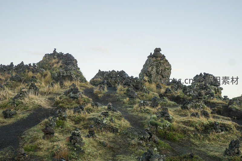 在开阔的草原背景中,几座孤峰耸立,峰顶堆叠着精心平衡的石头,既是自然奇观,也是旅人留下的独特印记。