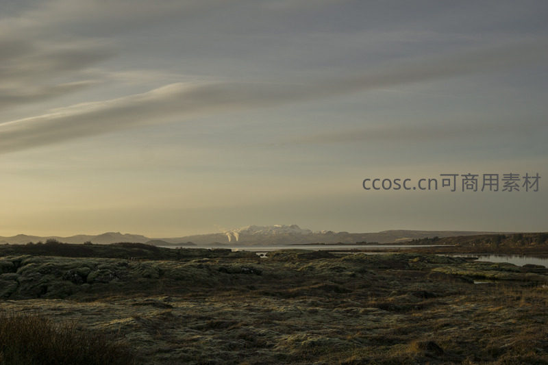 金色暮光下,覆盖苔藓的湿地延伸至远方平静湖泊,背景是白雪皑皑的山脉轮廓,天空流云舒展,整个画面充满宁静诗意与自然的恢弘感。