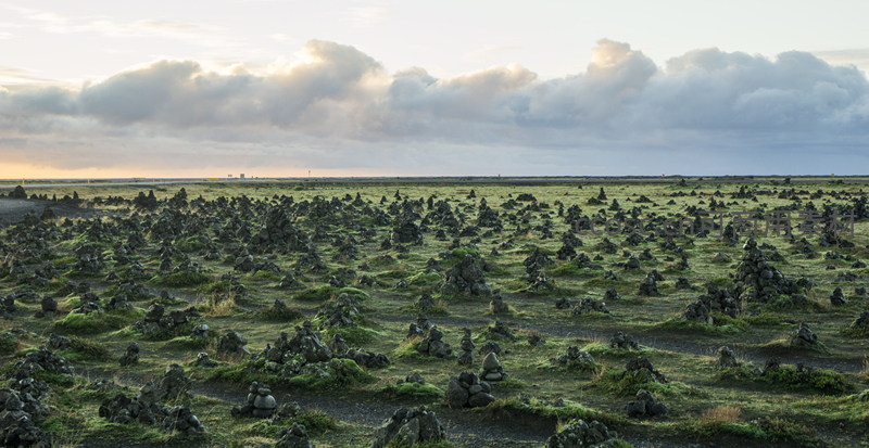 在云层投下斑驳光影的辽阔苔原上,无数由火山岩堆砌的石堆星罗棋布,绿色植被点缀其间,展现出大自然鬼斧神工的原始地貌与无垠空间感。