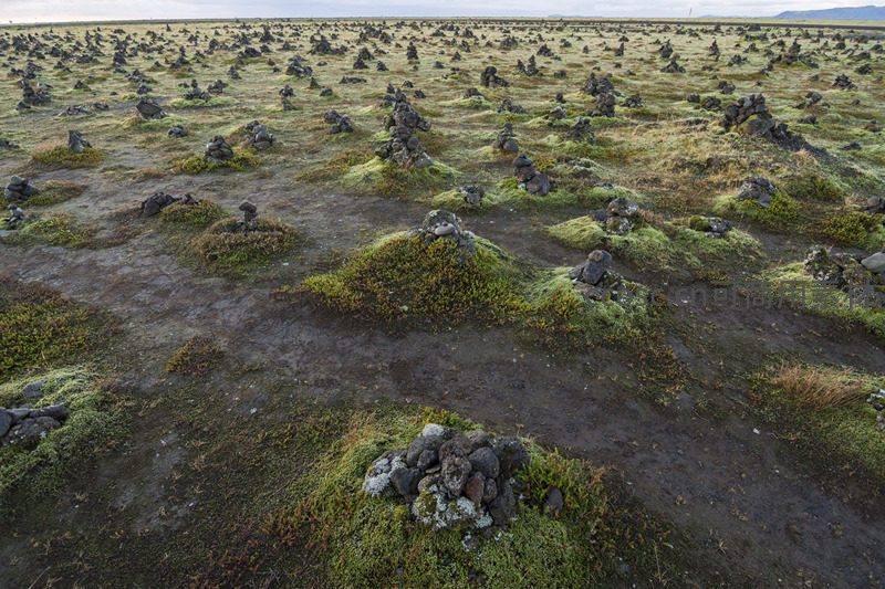 广袤的火山岩原野上覆盖着翠绿苔藓,岩石堆叠如星点散落,远处山峦起伏,展现原始而宁静的自然之美。