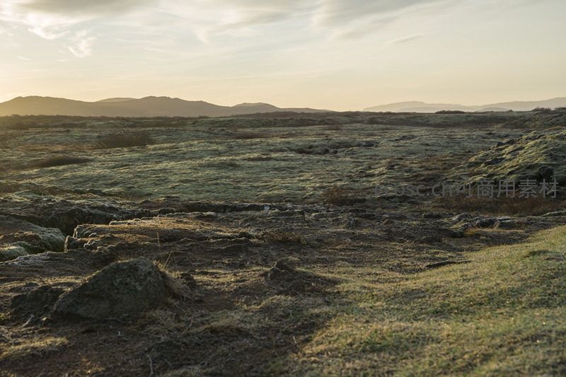 夕阳余晖洒在广袤的苔原之上,绿色苔藓与黑色熔岩交织,远处山脉轮廓清晰,天空云彩柔和,营造出静谧而壮阔的自然画卷。