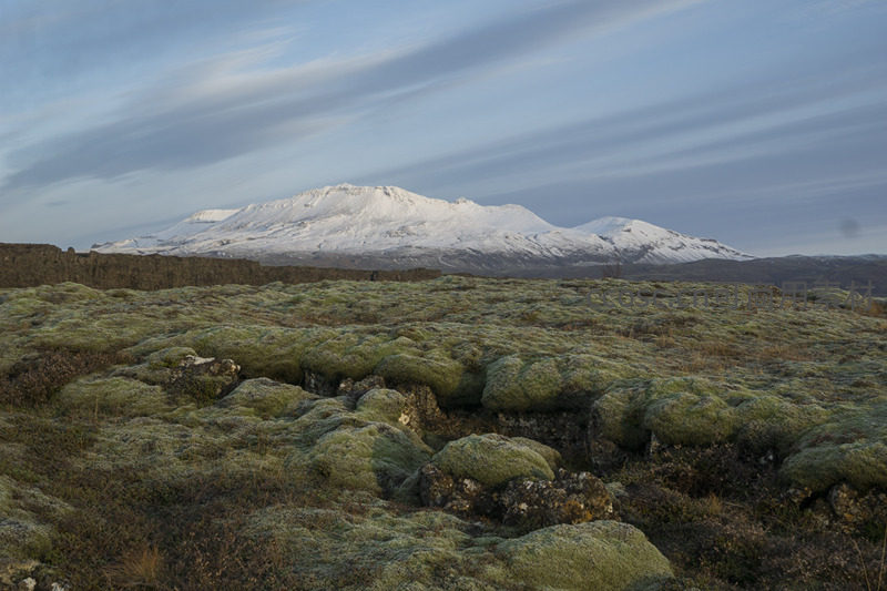 巍峨的雪山在背景中耸立,前景是被浓密绿苔覆盖的火山岩,天空流云如丝,整个画面呈现冷峻而生机勃勃的北欧自然风貌。