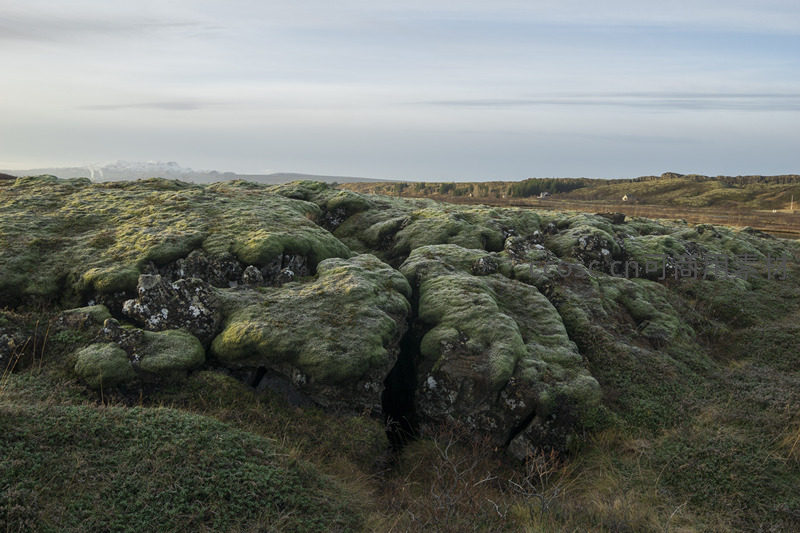 镜头聚焦于地表裂缝,青翠苔藓包裹着岩石,仿佛大地的呼吸孔。远处平原开阔,天空淡雅,展现原始地貌的生命力与沉静之美。