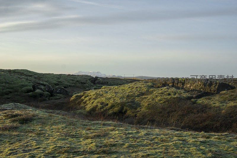 苔藓丘陵与远方朦胧雪山