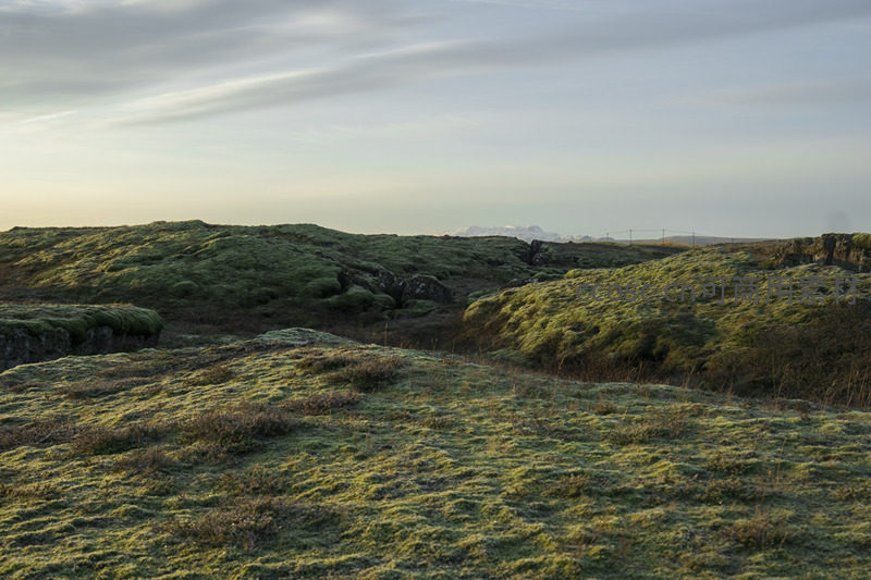 清晨阳光洒在覆盖着浓密绿色苔藓的火山岩上,远处山峦与云层相接,构成一幅宁静而原始的自然画卷。