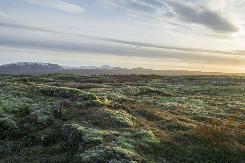 夕阳西下,金色光芒笼罩着无垠的苔原,岩石间绿意盎然,远方雪山轮廓清晰,天地间弥漫着静谧与壮阔。