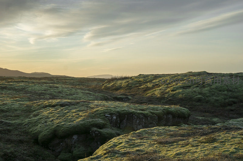柔和的夕阳光线穿透云层,照亮了布满苔藓的岩石缝隙,营造出温暖而神秘的氛围,仿佛时间在此刻凝固。