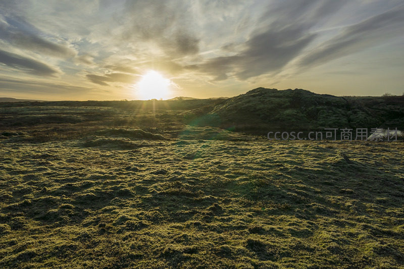 太阳从苔藓平原后升起光芒万丈