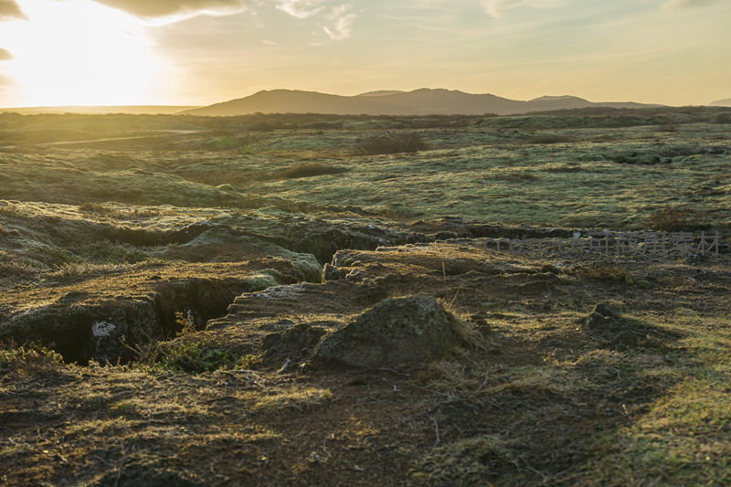 夕阳西下,金色阳光洒在覆盖着青苔的广袤苔原上,远处山峦轮廓清晰,天空云彩斑斓,营造出一片宁静祥和的自然景象。