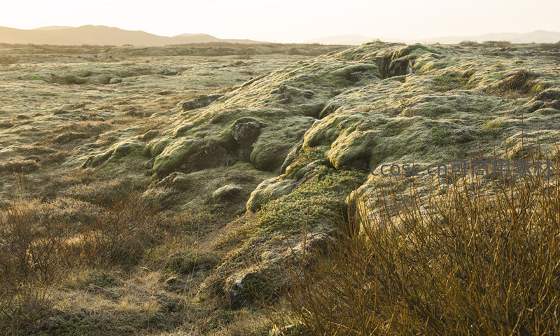 温暖的斜阳照射在起伏的火山岩上,绿色苔藓如绒毯般铺展,与干枯草丛形成鲜明对比,展现出地质奇观与生命交织的独特视觉美感。