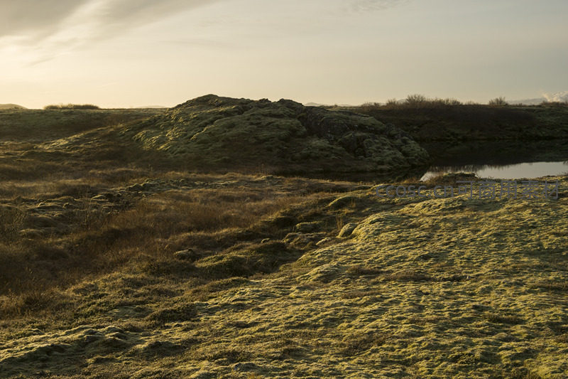 金色夕照中的苔藓丘陵与静水池塘