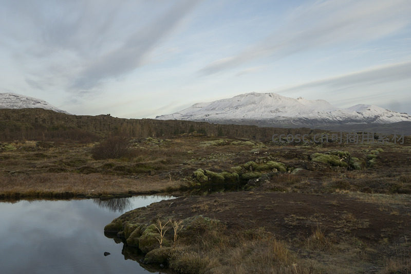 平静湖水映照着苍茫雪峰,周围是广袤的苔原植被,天空云丝飘逸,整体画面充满原始野性之美与自然和谐之感。