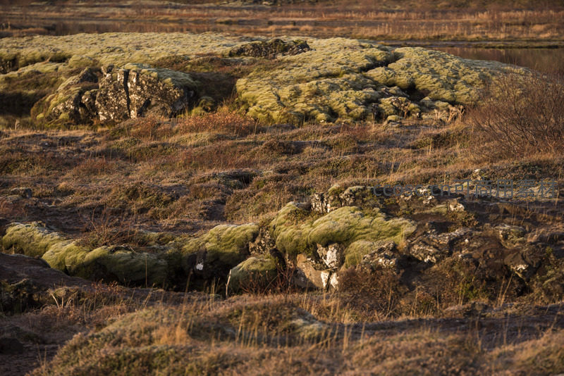 夕阳斜照在起伏的苔原上,岩石与苔藓被镀上金边,枯草与绿意交织,构成一幅宁静而富有诗意的大地风景画。