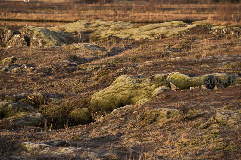 在温暖的斜阳下,大片火山岩被翠绿与灰白的苔藓温柔覆盖,展现出原始而宁静的自然生态景观。