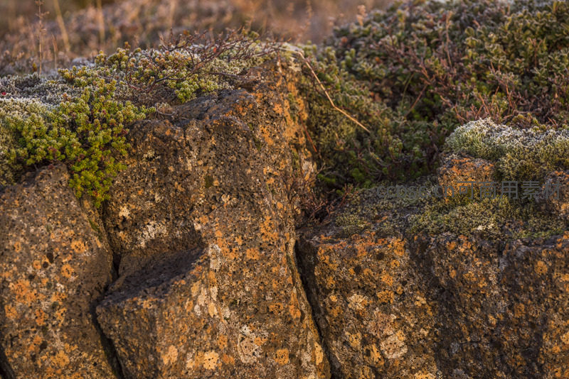 粗糙的火山岩缝隙间,顽强的低矮灌木和苔藓悄然生长,在暖光中展现着荒原上不屈的生命力。