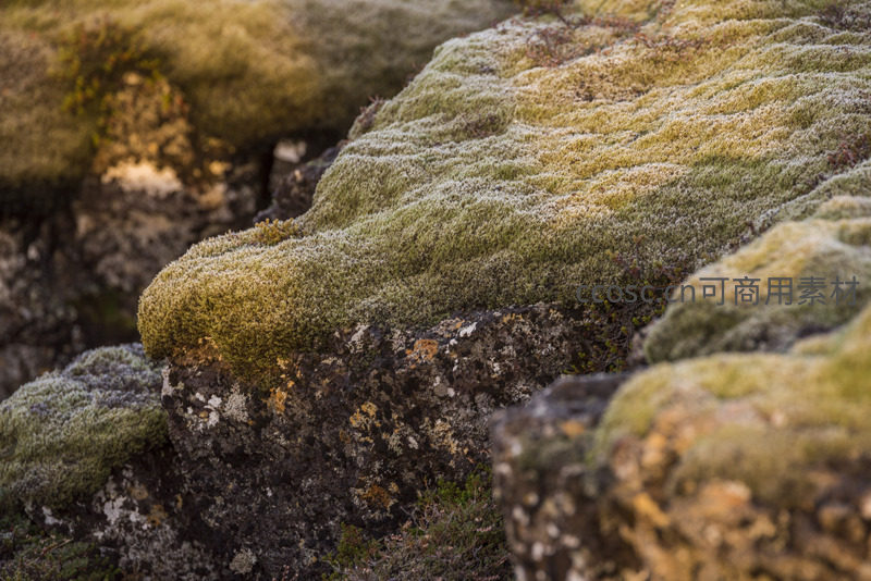 薄薄的晨霜如细盐般洒落在柔软的苔藓之上,阳光初照,为这片古老的石面披上一层晶莹而宁静的薄纱。