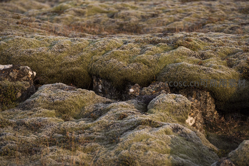 广袤无垠的苔原上,层层叠叠的苔藓如绿色绒毯铺展,随地形起伏,在夕阳余晖中勾勒出大地的温柔曲线。