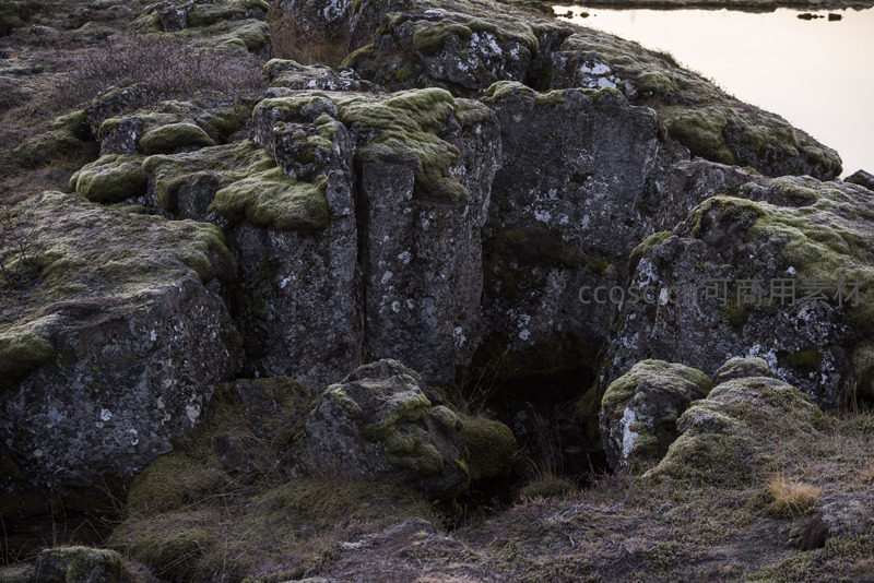 粗犷的岩石被柔软苔藓温柔包裹,形成刚柔并济的视觉对比,背景湖水映衬,更显自然界的和谐与神秘。