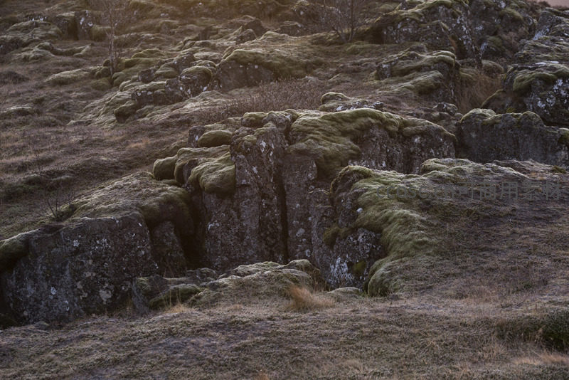 在温暖的夕照中,大片被苔藓覆盖的黑色岩石群显得格外神秘,光影交错间,突显了岩石的坚硬与苔藓的柔韧,营造出一种苍凉而诗意的自然氛围。