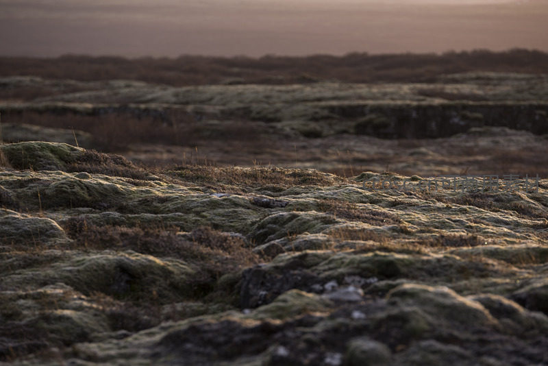 苔藓覆盖的火山岩地貌在夕阳下泛着金光