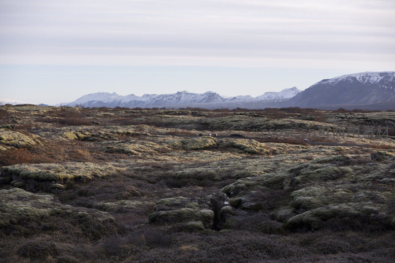 无垠的苔原铺展在眼前,绿褐交织的地衣如地毯般覆盖大地,远方连绵的雪山在薄云下若隐若现,构成一幅辽阔而宁静的北欧画卷。